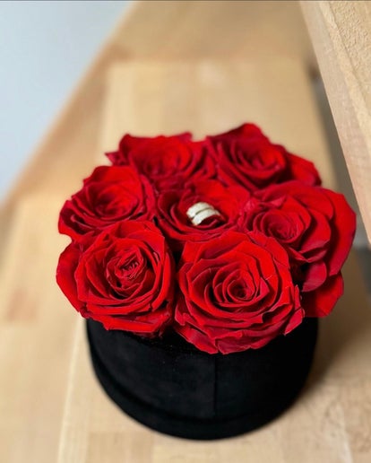 Een fluwelen flowerbox met prachtige rode rozen van langdurige kwaliteit, perfect voor het verstoppen van een speciaal juweel om je geliefde te verassen!
